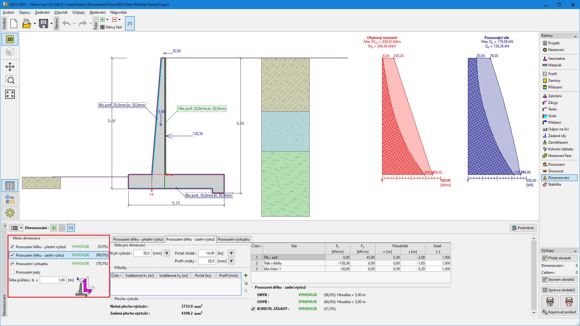 Běžně se dřík úhlové stěny posuzuje na tlak v klidu, zatímco pro ostatní posouzení se používá aktivní tlak. Obě volby lze změnit v rámu "Nastavení fáze".