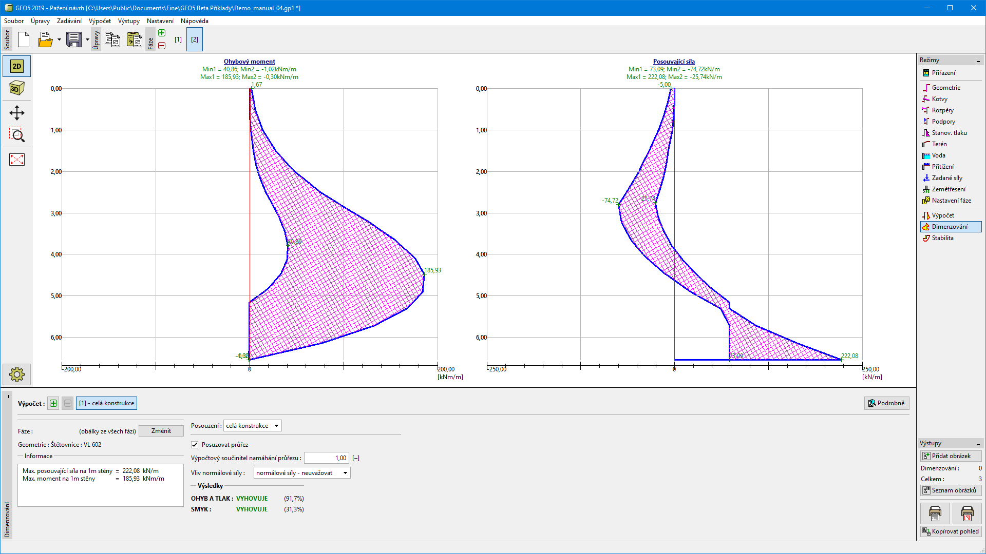Maximální hodnoty spočtených vnitřních sil (ohybových momentů a posouvajících sil) jsou zobrazeny ve spodní části rámu.