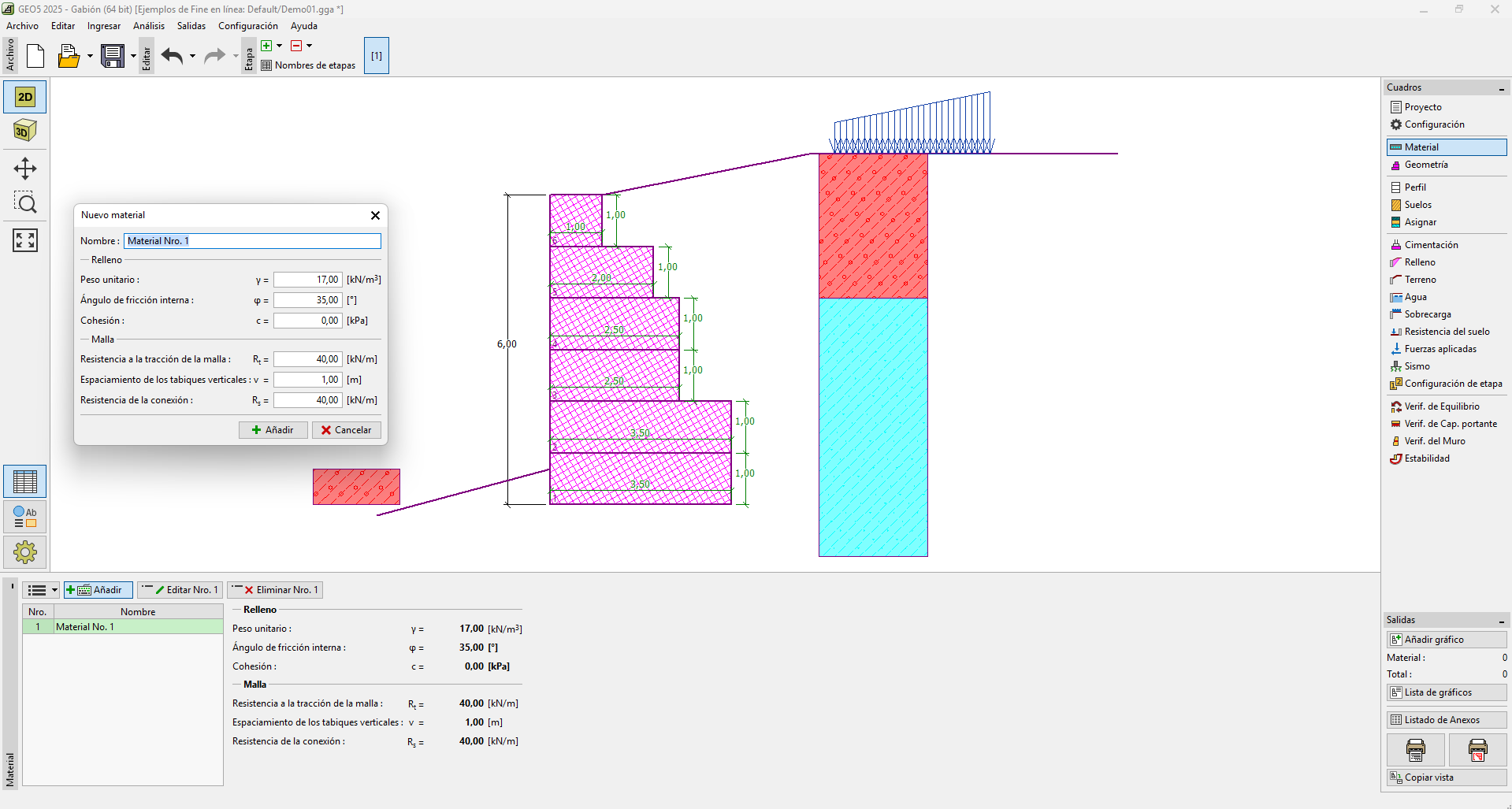 El cuadro "Material" contiene una tabla con una lista de rellenos (ingresados) y parámetros de materiales para aplicar al gavión de malla de alambre. Añadir materiales y mallas se realiza en el cuadro de diálogo "Nuevo material"